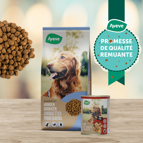 Chez Aveve, vous trouverez une large gamme d'aliments pour chiens afin de choyer votre petit ou grand compagnon à quatre pattes. Nous ne proposons que de nourriture pour chien de qualité supérieure, afin que votre chien ne soit pas lésé. Que vous recherchiez des aliments pour chiens, des aliments humides pour chiens ou des snacks, vous trouverez certainement ce que vous cherchez !