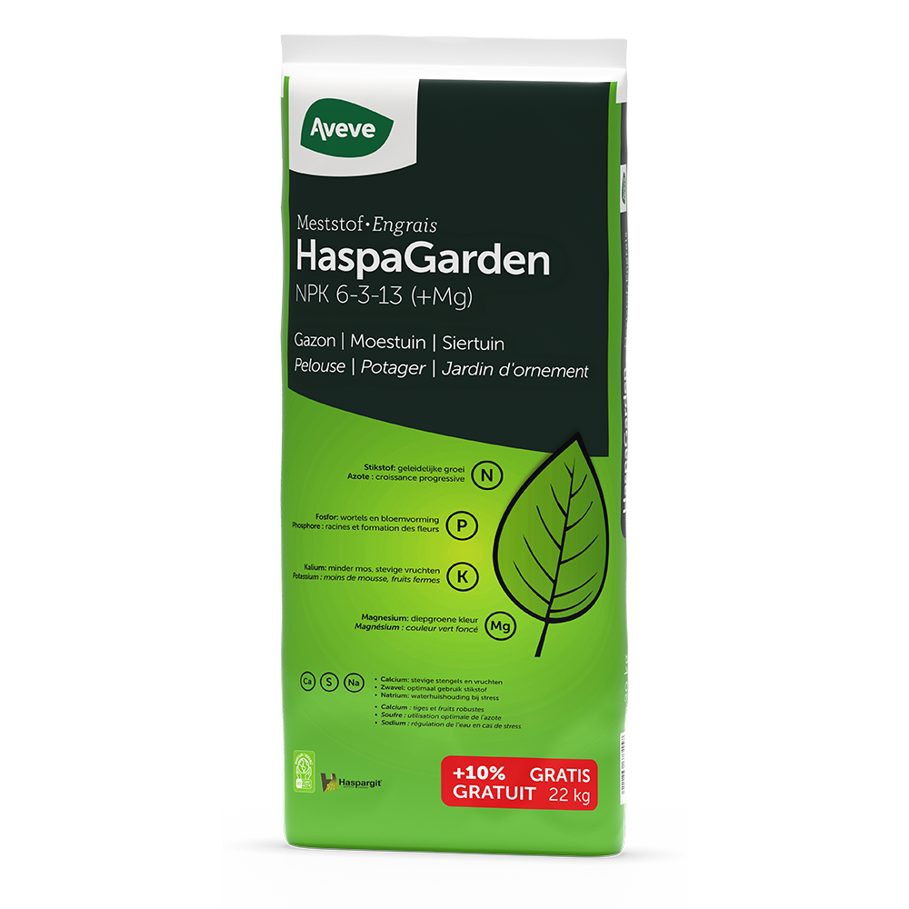 HaspaGarden Aveve est un engrais complet, innovant et durable qui peut être utilisé partout dans le jardin. Il contient tous les éléments nutritifs nécessaires pour assurer la croissance harmonieuse de plantes ornementales robustes, de légumes et fruits savoureux, ainsi que d’un gazon d’un vert profond sans mousse.