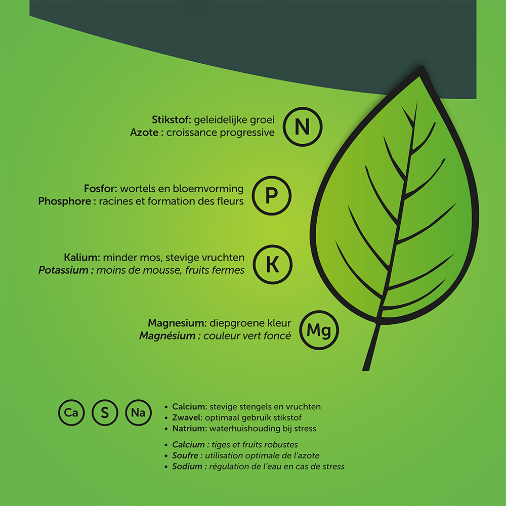 Notre formule garantit des tiges solides, des racines saines, une belle floraison et une couleur vert foncé. Grâce à une bonne gestion de l’eau en période de stress, une croissance progressive et une utilisation optimale de l’azote, vous obtenez moins de mousse et de meilleurs résultats.