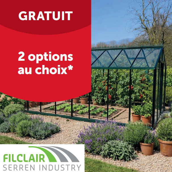 2 options gratuites au choix (à l’exception du montage) à l’achat d’une serre Filclair Flexi