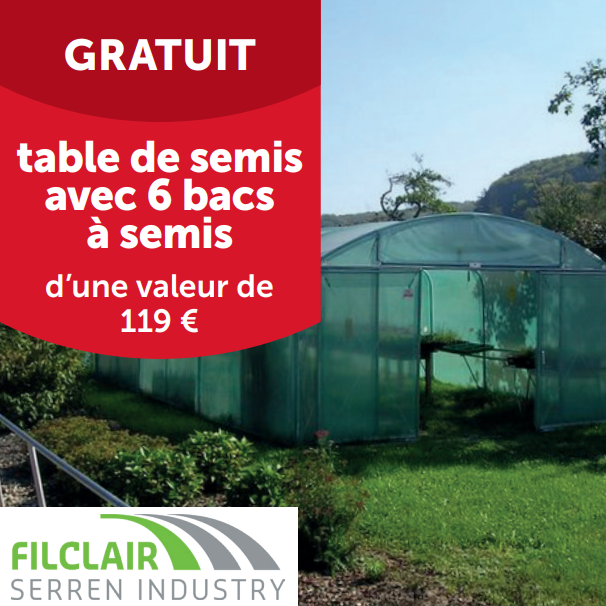 Table de semis avec 6 bacs de semis (d’une valeur de 119 €) offerte à l’achat d’une serre Filclair Elegant
