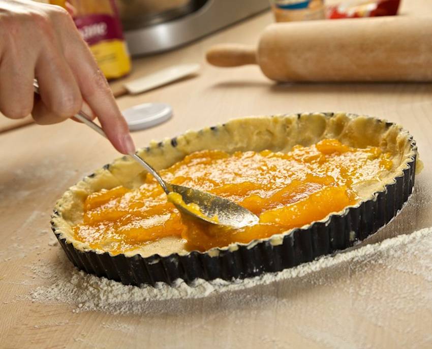 Nappez le fond de pâte brisée d'une fine couche de garniture aux abricots.