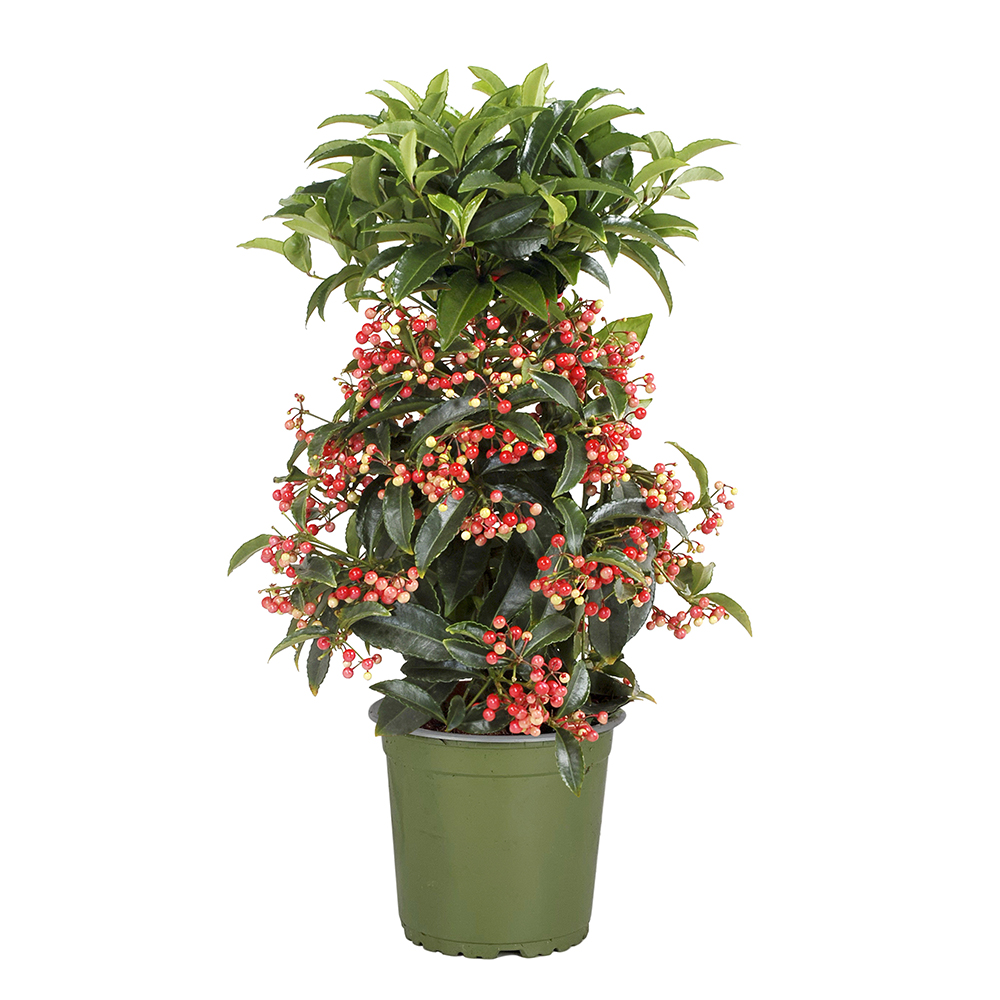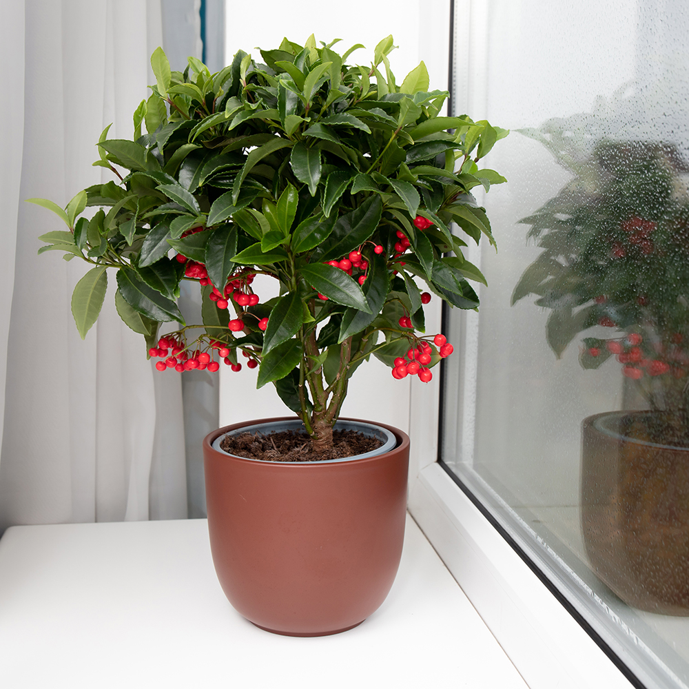 De Ardisia verwent je bijna het hele jaar door met extra kleur: in de zomer met witte of witroze bloemen, in de winter met zijn typische rode bessen.