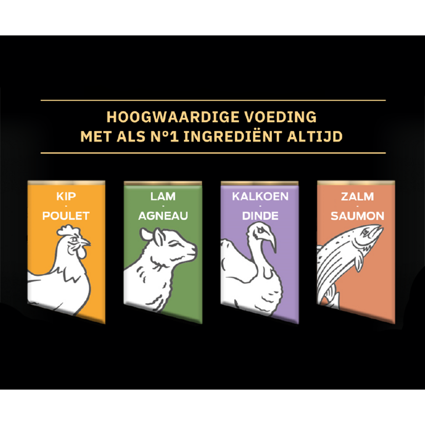 PRO PLAN® hondenvoer heeft altijd vlees of vis van hoge kwaliteit als eerste ingrediënt. Het hondenvoer is ontwikkeld door dierenartsen en bevat geen kleurstoffen.