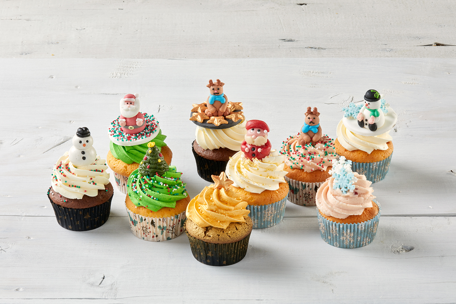 Spuit een dot chocobotercrème op de cupcakes. Decoreer met suikerfiguurtjes zoals sneeuwvlokken, sprinkles en kerstmannetjes. Of leg er een schijfje rolmarsepein of suikerpasta op, versierd met suikerfiguurtjes.